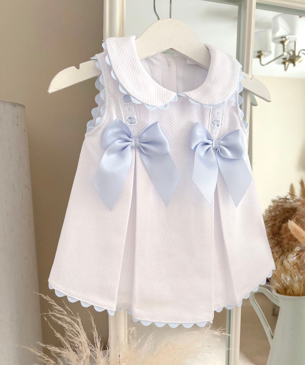 Girls waffle A lined Bow White and Baby Blue Collared Dress